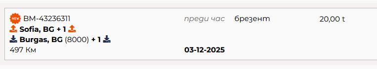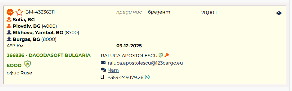 След като опишете маршрута с маршрутните точки, довършете попълването на описанието на товара и го публикувайте. Публикуваният товар ще се визуализира по следния начин при търсене на товари.